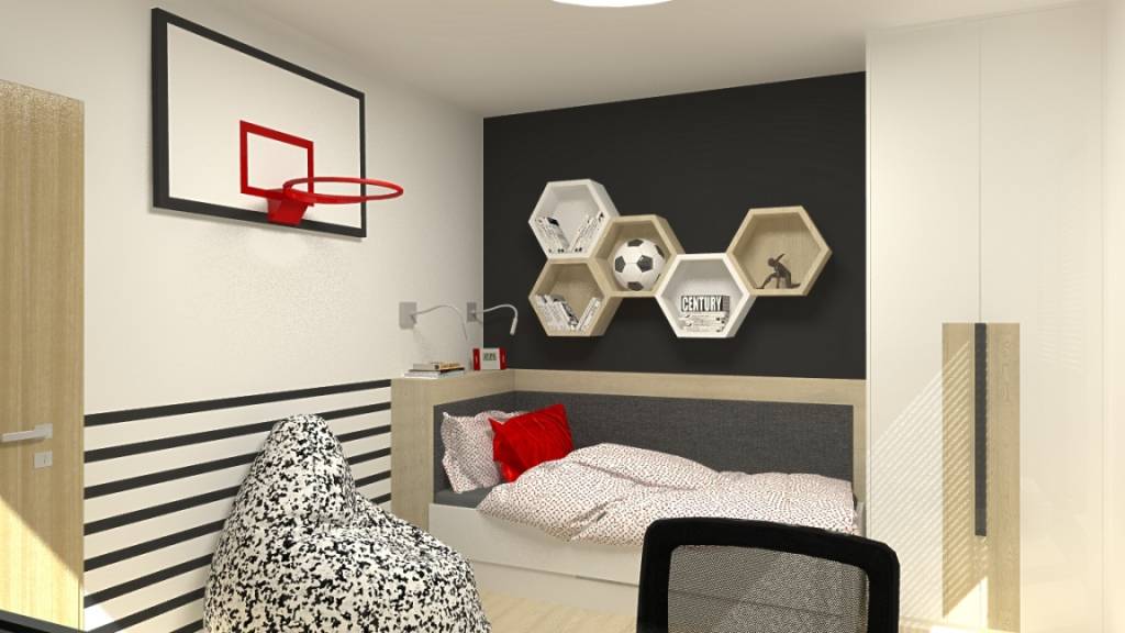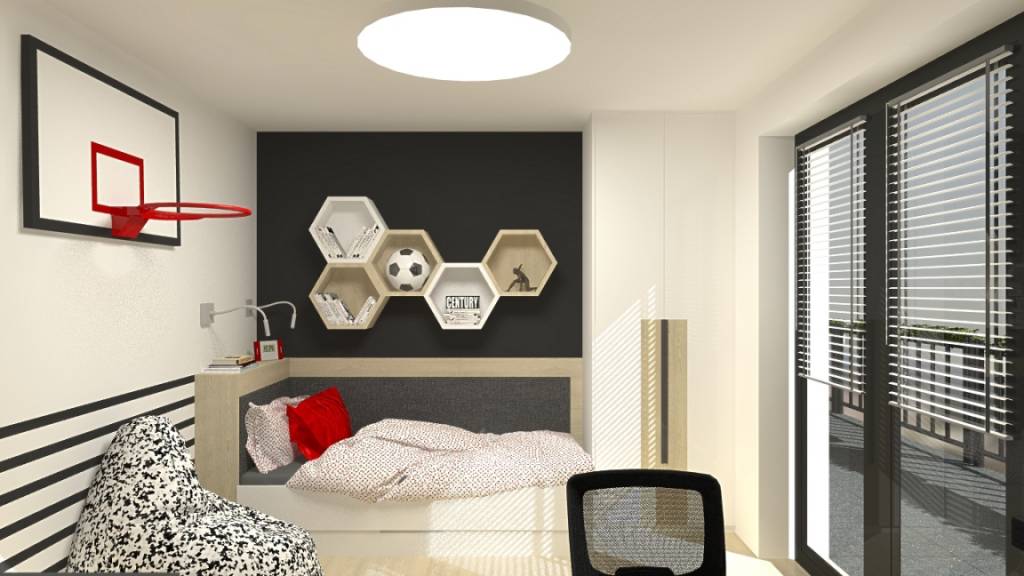 Izba pre 9-ročného vášnivého futbalistu, ktorý si vo svojom kráľovstve želal mať aj basketbalový kôš a sedací vak. Na stene sme mu vytvorili veľkoplošné tapetu na mieru s menami obľúbených futbalistov umiestnenými do krajiny pôvodu. Posteľ ponúka jedno ďalšie výsuné lôžko, ak napr. príde kamarát prenocovať.