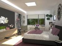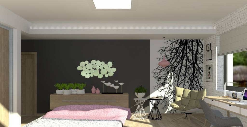 Izba pre dospievajúcu slečnu je prvou miestnosťou, ktoré sme zariaďovali v novostavbe rodinného domu. Súčasťou izby je rozmerný šatník a s izbou susedí slečnina osobná kúpeľňa, ktorú vám predstavíme v ďalšom vstupe. V zmysle požiadaviek mladej dámy sme použili tehlový obklad (zvolili sme svieži biely odtieň), prírodné drevo a staroružové akcenty a túto škálu sme doplnili už len neutrálmi: sivou, antracitovou a krémovou. Parkety z masívneho dreva nadväzujú na rovnakú podlahu v celom dome. Knižnica v netradičnom dizajne je vyrobená na mieru, aby výškovo presne zapasovala pod vyššie položené okno. Pracovný stôl a komoda sú na štíhlych nožičkách pre odľahčený dojem. Celočalúnená kontinentálna posteľ má veľkorysú šírku 140 cm. Slečne sme vytvorili kútik na čítanie s dizajnovým kreslom; kútik vymedzuje tapeta s grafickým motívom. Centrálne osvetlenie zabezpečuje stropné LED svietidlo doplnené o náladové osvetlenie v stropnej rampe a funkčné svietidlá na čítanie.