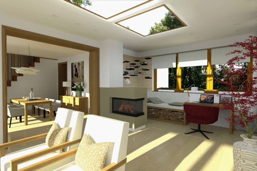 Obývačka je veľkorysým priechodom prepojená s jedálňou, z krorej je priamy vstup na terasu a do zahrady. Za krbom je vytvorené zákutie napríklad na posedenie pri knihe.