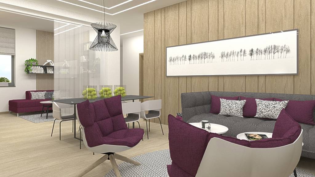 Pracujeme na návrhu zariadenia bytu v pripravovanej novostavbe bytového komplexu na Bezručovej ulici v Bratislave. Byt bude slúžiť rodine, ktorá dlhodobo žije v zahraničí, ako zázemie počas ich občasných pobytov v Bratislave. Byt zariaďujeme v stave po klientskych dispozičných zmenách, ktoré majitelia uplatnili u developera. Aktuálne predstavujeme návrh otvoreného priestoru kuchyne a obývačky. Jeho súčasťou bude aj menšia TV izba, ktorá bude v prípade potreby využiteľná aj ako priestor na spanie. S cieľom zachovať vzdušnosť priestoru sme túto izbičku oddelili len presklenou stenou s matným sklom. Televízor je na otočnom ramene a tak bude možné sledovať ho aj od jedálenského stola. Pracovnú plochu v kuchyni sme od obývacej časti vizuálne oddelili dekoratívnou lamelovou zástenou, čím sa zachová kontakt medzi človekom pracujúcim v kuchyni a ostatnými členmi rodiny v obývačke. Vo vysokom bloku je zabudovaná chladnička aj mraznička ako jednotlivé kusy, potravinová skriňa, menšie spotrebiče (varná kanvica, toaster, kávovar) sú umiestnené v osvetlenej nike. Varná doska je so zabudovaným digestorom na recirkuláciu. Ako zástenu sme použili grafosklo. Svetlík z kuchyne do kúpeľne sme zväčšili, aby sme do kúpeľne priviedli viac denného svetla.