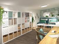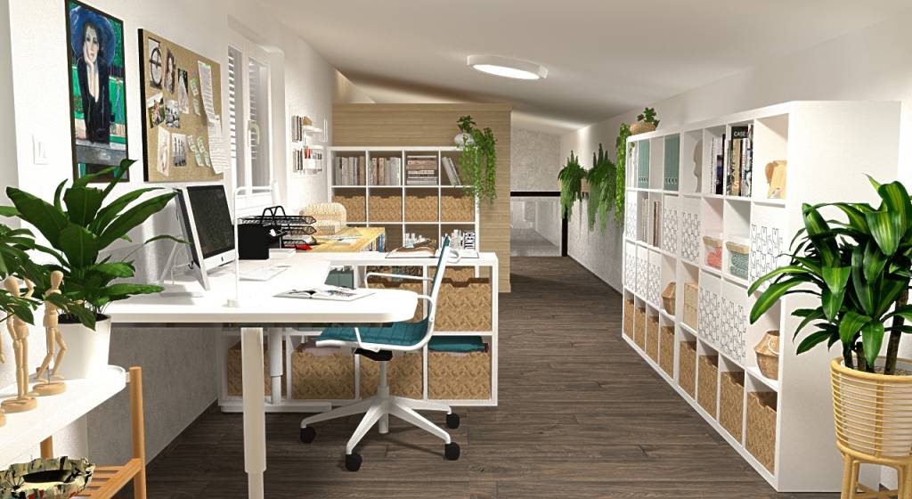 Cieľom tejto prerábky úzkeho, dlhého podkrovia bolo v rámci rozumného rozpočtu vytvoriť pekný priestor pre dennú prácu z domu, tvorbu, relax a množstvo zelene, čo znamenalo umiestniť výškovo nastaviteľný pracovný stôl pre 2 monitory, veľký stôl pre ručné práce a iné kreatívne vyžitie a novú domácu saunu. Miestnosť má tiež príležitostne slúžiť ako hosťovská izba. Vzhľadom na podstatne väčšie rozmery nebolo pôvodné miesto pre saunu vhodné, a tak som ju umiestnila do prednej časti podkrovia, čím vznikol vizuálne oddelený pracovný kút. Zachovala som pôvodný stôl pre kreatívne aktivity, ktorý má peknú, priestrannú pracovnú dosku. Množstvo úložných priestorov bolo potrebné zachovať, ale potešilo ma, že majiteľka súhlasila s výmenou tmavých knižníc za rovnaké, cenovo prijateľné z IKEA, avšak v bielej farbe, čo viditeľne presvetlilo a odľahčilo pôvodne tmavý priestor. Základnú farebnosť sme teda zjednotili na kombináciu bielej a prírodnej (dubové drevo, ratan, prútie), ktorá tvorí pekný základ pre početné rastlinstvo. Na podnet majiteľky som ju doplnila výraznejšou dekoratívnou stierkou v smaragdovom odtieni. Oddychovú zónu som zadefinovala kobercom, ktorý opticky zmiernil slížovitý charakter miestnosti. Poza pracovný stôl som umiestnila samolepiace nástenné panely pre ochranu steny pri tvorbe a tiež pri schodisku, kde zrejme bude umiestnený stacionárny bicykel.