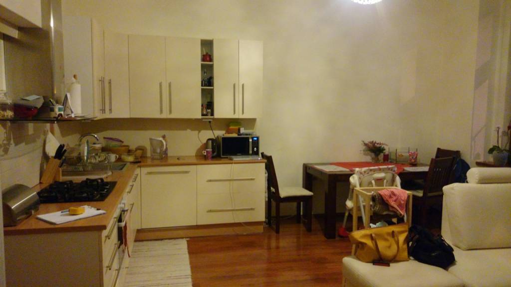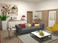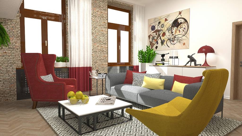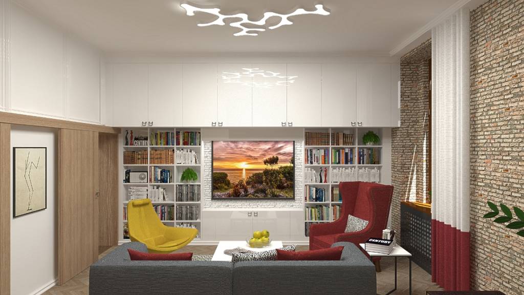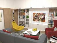 Predstavujeme návrh prvej miestnosti v rámci pripravovanej rekonštrukcie bytu v bratislavskom Starom meste. Ide o byt v pavlačovom dome, ktorý je národnou kultúrnou pamiatkou. Cieľom rekonštrukcie je okrem redizajnu v prvom rade racionalizácia priestoru, ktorý vznikol zlúčením dvoch bytov do jedného obytného celku, pričom výsledkom tohto zlúčenia bolo nevhodné dispozičné riešenie vzniknutého bytu. Z priestoru, ktorý rodina aktuálne využíva ako obývaciu izbu s kuchynským kútom (viď foto PÔVODNÝ STAV), sme na žiadosť majiteľa vytvorili veľkorysú miestnosť s atmosférou, ktorá spĺňa funkcie rodinnej obývačky, miesta pre stretnutia s priateľmi či čítanie kníh, hru na gitaru alebo chvíle strávené s deťmi. Súčasťou zadania bola veľká knižnica a namiesto televízora premietacie plátno pre príležitostné pozeranie filmov. Vyriešili sme to výsuvným premietacím plátnom, ktoré je inak zrolované za vrchnými skrinkami nad obrazom. Vstup do miestnosti z kuchyne aj predsiene sme kvôli úspore priestoru vyriešili posuvnými dverami. Pokiaľ ide o štýl, čiastočne sme podporili pôvodný charakter budovy (parkety, vysoké stropy, štuky), ale odľahčili sme ho súčasnými prvkami (nábytok v jednoduchých líniách, moderný sedací nábytok). Farebnosť a tvaroslovie sme zladili s reprodukciami Kandinského diel, ktoré si zvolili majitelia.