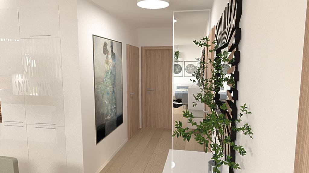 Predmetom zadania bolo zútulniť otvorený priestor obývačky s kuchyňou, ktorý často slúži aj ako domáce fitko J Po dohode s klientkou sme kuchynskú linku zachovali, len sme doplnili vrchný sokel, aby zostava siahala až po strop, čo je estetickejšie aj praktickejšie (neukladá sa tam prach). Majiteľka trvala na ponechaní bežeckého pásu v obývačke, a tak sme ho na mieru vyrobeným dekoratívnym paravanom decentne oddelili od kuchyne ako aj od pohľadu od vstupu do bytu. Nástenné zrkadlo sme potiahli až po strop kvôli optickému zväčšeniu priestoru. TV nábytok sme vymenili za na mieru vyrobenú zostavu s integrovaným TV, ktorá ponúka veľa úložných priestorov napríklad na športové potreby, pre ktoré majiteľka nemala vhodné miesto. Pri vstupných dverách sme umiestnili na mieru vyrobený botník s lavičkou na prezúvanie. Na vstavanom šatníku v chodbičke sme vymenili pôvodné zrkadlové posuvné dvere za nové s elegantným svetlým dekorom a namiesto toho sme veľké zrkadlo umiestili na bočnú stenu šatníka hneď pri vchodových dverách. Drevodekor na kuchynskej linke a zástene je pomerne výrazný, preto sme na nových kusoch nábytku zopakovali biely lak z kuchyne a doplnili ho dekoratívnou bielou fóliou s jemnou štruktúrou resp. vintage silver dekorom. Upokojili a zjednotili sme aj nástenné dekorácie. Namiesto jedného konferenčného stolíka sme zvolili 2 menšie príručné v podobnom odtieni dreva, ako je v kuchyni. Tento priestor obýva aj niekoľko mačiek, a teda škrabadlo zostalo na pôvodnom mieste s výhľadom do záhrady.