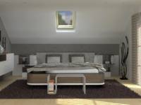 Spálňu v rodinnom dome začal zariaďovať mladý muž pred niekoľkými rokmi – dal položiť plávajúcu laminátovú podlahu a vyrobiť šatník na mieru do priestoru pod šikminou (viď obrázok PÔVODNÝ STAV). Na nejaký čas sa však projekt zastavil a miestnosť sa až doteraz nevyužívala. Cieľom našej spolupráce bolo vytvoriť nový koncept spálne pre mladú dvojicu, ktorá začína žiť v spoločnej domácnosti a dotiahnuť ho do realizácie, pričom základnou predstavou majiteľa bol elegantný štýl v neutrálnych tónoch. Po dohode s investorom sme laminátovú podlahu vymenili za príjemnejší vinyl s veľmi vydareným dekórom dreva. Pripravili sme dve alternatívy zariadenia spálne, obidve s využitím hotového nábytku kvalitnej značky (posteľ a príslušný mobiliár). Pôvodný vstavaný šatník, ktorý už nespĺňal estetické nároky, sme odstránili a na jeho miesto navrhli novú zostavu na mieru, ktorá štýlovo korešponduje s hotovým nábytkom. Priestor medzi dvomi rolldoormi pod strešným oknom sme využili ako kozmetický stolík pre mladú dámu. Aby sme sa vyhli problému s umiestnením svietidla nad kozmetickým stolíkom, použili sme zrkadlo s integrovaným LED osvetlením. Téma Alternatívy 1 nám vyplynula z tapety s digitálnym motívom krištáľového lustra, ktorá nás mimoriadne oslovila. Použili sme ju na dvere rolldoorov a stenu v záhlaví postele. Dominantou spálne sa potom stal skutočný krištáľový luster, ktorý miestnosti dodal dojem elegancie a prijateľného luxusu. Pohľadové plochy nábytku sú vo vysokom lesku v bielej a pieskovej farbe. Alternatíva 2 je postavená na väčšom farebnom kontraste a vyznieva o niečo striedmejšie. Nábytok je opäť vo vysokom lesku avšak v odtieňoch kakao a bavlna. Tapetu s jemným vzorom sme v tomto prípade použili na dvoch stenách – oproti oknám a v záhlaví postele. Stropné svietidlo v modernom dizajne dopĺňa bodové náladové osvetlenie. Investor sa rozhodol pre realizáciu prvej alternatívy.