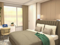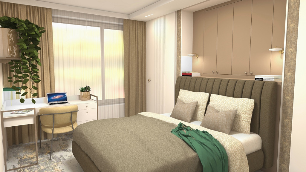 Investorka si v spálni želala walk-in šatník, čo však daná plocha miestnosti neumožňovala. Prioritou teda bolo vyriešiť maximum úložných priestorov čo najelegantnejším spôsobom . Vytvorili sme veľkorysú nábytkovú zostavu, do ktorej je zakomponovaná plnohodnotná manželská posteľ. Súčasťou zostavy sú 2 šatníkové skrine s dverami posuvnými poza záhlavie postele (nemusia sa otvárať do priestoru) a dve 2-dverové skrinky hlbšie vsadené nad posteľou. Za záhlavím postele tak vznikla odkladacia plocha ako náhrada za nočné stolíky, ktorá tiež môže byť využitá ako úložný priestor na otváranie výkopom. Súčasťou zadania bol aj menší pracovný kút s výhľadom von oknom, ktorý sme vyriešili rohovým stolíkom na mieru a zostavou nástenných skriniek a police. Pre pocit pohodlia a luxusu sme použili celoplošný koberec.